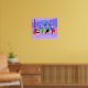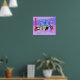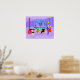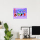 This Retro Tropical Cocktail Party Stretched Poster is intoxicating in its detail. The cartoon design features the type of wildly sophisticated cocktail party that is normally only seen in movies from the 1960s. There is a mid century modern living room filled with partygoers enjoying the swanky, purple decor. A lovely woman in a French maid's uniform is carrying a tray of martinis. She is standing beside a red, cone fireplace with a roaring fire. In the centre of the room, an attractive couple is lounging in orange egg chairs. The woman is wearing a bright, green dress. The man is wearing a black suit with a red tie. They are each holding a martini. Another couple is getting cosy beneath a dangling, yellow, Sputnik chandelier. The distinguished, white haired gentleman is wearing a blue suit, light blue shirt and red tie. He is also holding a martini in each hand, showing the world that his partying days are far from over. His companion is a shapely blonde in a stunning red dress. Behind this scene, we can see through floor to ceiling glass walls. The outdoor scene features a round, turquoise swimming pool. We can see the purple silhouette of a woman dipping her legs into the water. Between purple, stone walls, there are silhouettes of palm trees. The silhouettes of dancing and talking partygoers are also visible. If there's one thing this proves, it's that, while people who live in glass houses shouldn't throw stones, they should definitely throw parties!