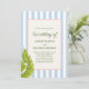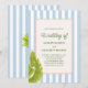 Celebrate your special day with a playful retro tropical vibe! This wedding invitation features a soft blue striped background, palm fronds, and a rope-bordered frame with green text. Perfect for couples who love whimsical elegance with a touch of island flair.
