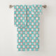 This Retro Turquoise and White Starbursts Towel Set is so adorably space age you won’t be able to contain your enthusiasm. And, why would you want to? This 1960’s mid century modern inspired design features a dark heather grey background and rows of perfectly imperfect rectangles in turquoise, white, and dove grey. Kitschy white and turquoise starbursts are placed in randomly selected rectangles. The opposite side features the same pattern in a larger print. This mod pattern will make you feel like you jumped in a time machine and set the dial for irresistibly vintage!