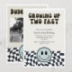 card featuring illustration of a vintage black and white chequered pattern. The text says "growing up two fast."
