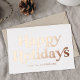 Stylish, trendy holiday card displaying "Happy Holidays" on the front in retro rose gold foil lettering with a white background. Personalise the front of the non-photo holiday card by adding your name/business name, the year, or other custom text. The back of the rose gold foil holiday card features your custom message in black lettering. Designed to coordinate with our Retro Typography Holiday card collection.