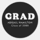 Custom graduation stickers featuring "Grad" in bold white retro lettering with a black background (editable color). Personalize the black and white graduation stickers by adding the graduate's name and graduation year. The personalized graduation stickers are perfect to use for sealing envelopes, graduation favor bags, etc.