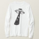Step into the mysterious and otherworldly with our women's long-sleeve t-shirt, showcasing a striking graphic of an alien abduction. The design features a sleek black and white UFO beaming down a captivating light, evoking the thrill of extraterrestrial encounters. Perfect for sci-fi enthusiasts and those who love to embrace the unknown, this t-shirt blends style with a touch of cosmic intrigue.