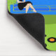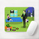 This Retro Urban Cartoon Couple Mousepad features the cartoon drawing of an elegantly decorated penthouse apartment, overlooking a city skyline. The apartment features a green floor and a green brick wall. On the wall are four Classic Movie Martini Stretched Canvas Prints, also available from StrangeLittleOnion's Zazzle store (hint, hint!). Three of the prints feature turquoise backgrounds and one is on a black background. Beneath the canvas prints, is a blue, mid century modern sofa. A sophisticated, raven-haired beauty is sitting on the sofa. She is wearing a classic, little, black dress with a hot pink bodice. On the opposite side of the room there is a suave, tall, dark, and handsome man. He is wearing a black suit, white shirt, and green tie. In one hand, he is holding a vinyl record album, and, in the other hand, he is holding a fun album cover. On the floor, there is an orange ottoman holding a green and black record player. Propped against the ottoman is another album cover with a record rolling out of the side. There are also three colourful vinyl albums scattered about the floor. Behind the man, we can see through the sliding glass doors onto a green balcony. A white cat wearing a pink collar is perched on the edge of the balcony. Beyond the cat, there is a breathtaking city skyline complete with skyscrapers and a yellow crescent moon. If this is how the other half lives, sign me up!