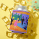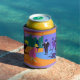 This Customisable Retro Urban Rooftop Party Can Cooler is intoxicating in its detail. The cartoon design features the type of wildly sophisticated cocktail party that is normally only seen in movies from the 1960s. There is a lot for the partygoers to take in. From the comfort of a penthouse apartment, guests are enjoying the view and the ambiance. The lighting sets the mood and we are able to see the darkened silhouettes of an attractive couple dancing the cha-cha. On the floor, there is a purple, portable, record player at the feet of the dancing couple. Several albums have been scattered nearby. Even with the dimmed lighting that makes practically everything in the room appear in shades of purple, blue and black, we can tell that everyone is dressed to the nines. Behind the dancing, indoor couple, there is a gentleman in a black suit holding a martini glass. He is talking to a dark haired beauty who is standing near one of the floor to ceiling glass walls. From a lampstand, a single bulb is casting a romantic glow on the scene. The only thing missing is the lampshade. Hmm... Where is the shade? It's on the head of a tipsy man who has taken the party outside to the orange rooftop. He's clearly got some fine dance moves and he isn't afraid to show them to the world! His companion is a shapely, blonde woman in a bright pink dress. Her back is arched as she throws back her martini in an uninhibited fashion. Beyond the party, there is a breathtaking teal skyline, complete with skyscrapers and a purple sky. The opposite side is light purple and can be personalised for your occasion. If this is how the other half lives, sign me up!