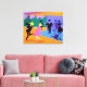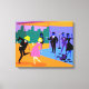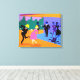 This Retro Urban Rooftop Party Stretched Canvas Print is intoxicating in its detail. The cartoon design features the type of wildly sophisticated cocktail party that is normally only seen in movies from the 1960s. There is a lot for the partygoers to take in. From the comfort of a penthouse apartment, guests are enjoying the view and the ambiance. The lighting sets the mood and we are able to see the darkened silhouettes of an attractive couple dancing the cha-cha. On the floor, there is a purple, portable, record player at the feet of the dancing couple. Several albums have been scattered nearby. Even with the dimmed lighting that makes practically everything in the room appear in shades of purple, blue and black, we can tell that everyone is dressed to the nines. Behind the dancing, indoor couple, there is a gentleman in a black suit holding a martini glass. He is talking to a dark haired beauty who is standing near one of the floor to ceiling glass walls. From a lampstand, a single bulb is casting a romantic glow on the scene. The only thing missing is the lampshade. Hmm... Where is the shade? It's on the head of a tipsy man who has taken the party outside to the orange rooftop. He's clearly got some fine dance moves and he isn't afraid to show them to the world! His companion is a shapely, blonde woman in a bright pink dress. Her back is arched as she throws back her martini in an uninhibited fashion. Beyond the party, there is a breathtaking teal skyline, complete with skyscrapers and a purple sky. If this is how the other half lives, sign me up!