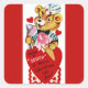A yellow teddy bear is putting a scoop of strawberry ice cream onto a cone. Message: What a “SCOOP” to have a Valentine like you! Image of a Retro Valentine on a custom red background.