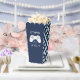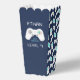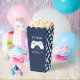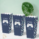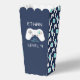 Designed to match our Level Up birthday party invitations and accessories, this retro gamer themed favour box features a game controller illustration on a navy blue background with "[Name] has reached level [age]" in vintage digital style lettering.