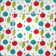 Craft up festive gifts, decor and more with this patterned fabric. It features simple illustrations of retro Christmas ornaments in bright red, turquoise blue and lime green along with coordinating asterisk or star shapes against a white background. The graphics have a lightly distressed style for a vintage look.