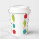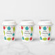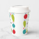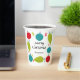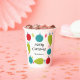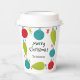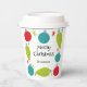 Jingle and mingle in style with paper cups that are ready to be personalised with your own headline and name or other custom text. Your text is surrounded by illustrations of tree ornaments in bright red, turquoise blue and lime green with a fun vintage style. The text and graphics appear on both sides of this cup.