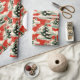 This vintage Christmas wrapping paper features a whimsical winter scene with fluffy clouds, snow-dusted pine trees adorned with red berries, and a touch of snow. The paper boasts a classic red background with a retro illustration style, evoking a sense of nostalgia and holiday cheer.