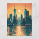 A vibrant and colourful illustration of the New York City skyline at sunset, rendered in a retro vintage style. The iconic Empire State Building stands tall in the centre, bathed in golden light. The sky is ablaze with orange, pink, and purple hues, reflecting in the calm waters below. A sailboat and a motorboat glide peacefully across the river, adding a touch of serenity to the scene.