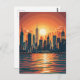 A vibrant and colourful illustration of the New York City skyline at sunset, rendered in a retro vintage style. The iconic Empire State Building stands tall in the centre, bathed in golden light. The sky is ablaze with orange, pink, and purple hues, reflecting in the calm waters below. A sailboat and a motorboat glide peacefully across the river, adding a touch of serenity to the scene.