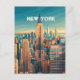 A vibrant and colourful illustration of the New York City skyline at sunset, rendered in a retro vintage style. The iconic Empire State Building stands tall in the centre, bathed in golden light. The sky is ablaze with orange, pink, and purple hues, reflecting in the calm waters below. A sailboat and a motorboat glide peacefully across the river, adding a touch of serenity to the scene.