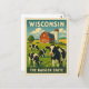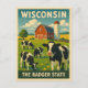 Celebrate the simple beauty of rural America with this vintage travel-inspired postcard featuring the state of Wisconsin. Framed in classic retro style, the scene showcases lush fields, grazing cows, and a charming barn beneath open skies.