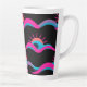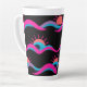 Vibrant, seamless 80s-inspired geometric wave and sun pattern in neon pink, turquoise, and black. Crisp vector style with soft gradient waves for a retro-futuristic synthwave/outrun vibe. Perfect for coffee, gifts, or decor.