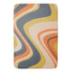 A groovy retro design featuring wavy lines in a colour palette of orange, navy, yellow and beige.