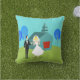 This Retro Wedding Couple Outdoor Pillow will have you hearing wedding bells. The 1960's style, minimalist art design features a bride and groom on their wedding day. The happy couple looks good enough to be standing atop a wedding cake. But they aren't. They're standing on lush, green grass. The debonair Mr. is wearing a classic, black tuxedo with black bow tie. Down, ladies! He's taken! He is holding the hand of his beautiful Mrs., who looks positively radiant in her tea length, white gown with form fitting waist and flared skirt. She truly looks like a princess with her tiara and gauzy, white wedding veil resting on her pretty blonde head. Beside them, a path in the grass leads to the world's most charming chapel. The quaint, teal and turquoise church is the perfect setting for saying, "I do!" Yes, here is the church. Here is the steeple. We can only assume that, behind those bright red, double doors is a roomful of people just waiting to share in this couple's happiness. The picturesque setting also includes four, stylistic, cartoon trees in shades of blue. It's a beautiful day for a wedding, as we can see from the flawless aqua sky. The only thing missing from this mid century modern design is the rice, and we can assume that will be forthcoming. The opposite side of this pillow is solid aqua and can be personalised.