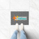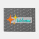 Aqua welcome with retro orange and yellow stars on a grey star pattern background.