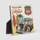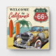 Retro "Welcome to California" Route 66 poster, with a vintage automobile parked on a sandy Californian beach with a palm tree and surfboards. Great retro style travel poster gift.