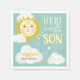 Introducing our adorable "Here Comes the Son" baby shower party napkin. This whimsical napkin features a charming hand-painted sun with a friendly face, surrounded by fluffy clouds and twinkling stars, all set against a soft sky-blue background. Perfect for adding a touch of playful delight to your baby shower, these napkins are personalised with the name "Madeline's Baby Shower," making them a unique and memorable addition to your celebration. The cheerful design and vibrant colours are sure to bring smiles to your guests as they enjoy the festivities.