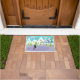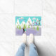 This Retro Winter Ski Resort Door Mat has something for everyone. The picturesque cartoon drawing features a snow-covered mountain range with green cedar trees. A lone skier, wearing red, orange, and royal blue, can be seen swooshing down the tallest mountain. Snow is continuing to fall from clouds in the turquoise sky. We can see the silhouettes of happy people whizzing by in ski lift gondolas. Perched above the trees, there is a mid century modern, elevated ski chalet. Through the glass walls, we can see a dark haired beauty resting in bright purple egg chair. She is wearing a green sweater, navy blue pants and a cumbersome white cast on one leg. Don't feel too sorry for her. She's enjoying the warmth of an olive green, cone shaped fireplace with a roaring fire. She also has an awesome view of a couple of romantic ice skaters on a frozen, purple ice rink. The man of the duo is wearing a black jumpsuit with a yellow turtleneck. His hands are wrapped around his partner's waist. She's a gorgeous redhead whose hair is in a ponytail. She is wearing an ice blue top and short, flouncy, sea foam green skirt. They are having the time of their lives, but let's hope they notice the crack in the ice.