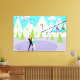 This Retro Winter Ski Resort Stretched Canvas Print has something for everyone. The picturesque cartoon drawing features a snow-covered mountain range with green cedar trees. A lone skier, wearing red, orange, and royal blue, can be seen swooshing down the tallest mountain. Snow is continuing to fall from clouds in the turquoise sky. We can see the silhouettes of happy people whizzing by in ski lift gondolas. Perched above the trees, there is a mid century modern, elevated ski chalet. Through the glass walls, we can see a dark haired beauty resting in bright purple egg chair. She is wearing a green sweater, navy blue pants and a cumbersome white cast on one leg. Don't feel too sorry for her. She's enjoying the warmth of an olive green, cone shaped fireplace with a roaring fire. She also has an awesome view of a couple of romantic ice skaters on a frozen, purple ice rink. The man of the duo is wearing a black jumpsuit with a yellow turtleneck. His hands are wrapped around his partner's waist. She's a gorgeous redhead whose hair is in a ponytail. She is wearing an ice blue top and short, flouncy, sea foam green skirt. They are having the time of their lives, but let's hope they notice the crack in the ice.
