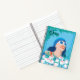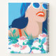 Retro woman with flowers and sunshine and sunglasses, bright red lipstick and dark hair. What a sunny bright and colourful beach scene on a spiral bound journal.