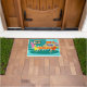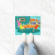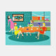 This Retro Women's Weekly Card Game Door Mat features a cartoon drawing of four mid century modern women at a hen party. They are socialising in a stylish dining room. On a turquoise and teal brick wall, there is a Mid Century Modern Globe Art Stretched Canvas Print available from StrangeLittleOnion's Zazzle store. My, they have good taste! Through sliding glass doors, we can see the lush, green lawns of suburbia. Across the street, there is a sleek orange house with a pink and white car parked in the carport. Back in the dining room, three women are seated at a round table with an orange tablecloth. There is a redhead in a yellow dress, a brunette in a green dress, and a blonde in a red dress. They are holding cards in their hands. Four teacups are on the table just waiting to be filled by the raven haired hostess in a pink wiggle dress. She is carrying a tray with a tea carafe perched on top of it. All of the women are having a wonderful time, but they should probably keep an eye on the blonde. If that card she's holding behind her back is any indication, she cheats!