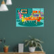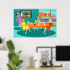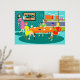 This Retro Women's Weekly Card Game Poster features a cartoon drawing of four mid century modern women at a hen party. They are socialising in a stylish dining room. On a turquoise and teal brick wall, there is a Mid Century Modern Globe Art Stretched Canvas Print, which is available from StrangeLittleOnion's Zazzle store. My, they have good taste! Through sliding glass doors, we can see the lush, green lawns of suburbia. Across the street, there is a sleek orange house with a pink and white car parked in the carport. Back in the dining room, three women are seated at a round table with an orange tablecloth. There is a redhead in a yellow dress, a brunette in a green dress, and a blonde in a red dress. They are holding cards in their hands. Four teacups are on the table just waiting to be filled by the raven haired hostess in a pink wiggle dress. She is carrying a tray with a tea carafe perched on top of it. All of the women are having a wonderful time, but they should probably keep an eye on the blonde. If that card she's holding behind her back is any indication, she cheats!