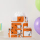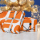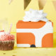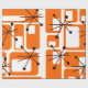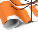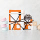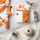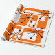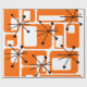 This retro wrapping paper is covered with mid-century modern orange squares and black starbursts.