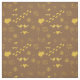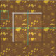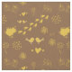 Retro yellow and brown pattern of birds, dots, footsteps, flowers, hearts, butterflies.