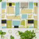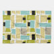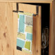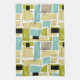 This funky mid-century modern kitchen towel features aqua blue, avocado green, yellow, and tan abstract rectangles, along with highlights of black and white starbursts. Add a pop of retro fun to your kitchen decor!