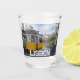 Retro yellow tram on street in Lisbon, Portugal Shot Glass