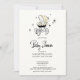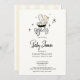 This delicately illustrated invitation features a vintage-style baby stroller in a soft, buttery yellow, surrounded by mid-century starbursts that whisper of simpler days and heartfelt gatherings. The elegant script and clean layout strike a graceful balance between playful and poised—inviting guests into a moment of meaning without excess.