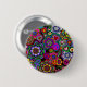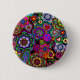 A button with a lively and colourful design of peace signs, paisley, ankhs, hearts, and flowers. A far-out flash back to the 1960's.