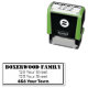 A slightly masculine return address stamp including 4 lines: Name (family or person), street 1, street 2, town. Font is easy to read, but can be customised, easily.