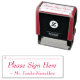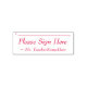 This respectable rubber stamp design features the message "Please Sign Here", along with a line that a signature or initials could be written above. It also features a personalised educator’s or teacher’s name. It could be be used by a tutor, teacher or educator to ask a student’s parent(s) or guardian(s) to review and acknowledge the grade that a student got on an exam, a project, an essay, a test, or some other school assignment.