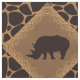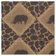 Alternating squares set on a diagonal of a deep chocolate brown rhinoceros silhouette set in a medium brown faux grassy texture diamond shape bordered in pattern of tall blades of grass. Alternating pattern with a dark-chocolate brown (almost black) and tan giraffe animal print background.