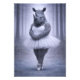 A poetic anthropomorphic rhinoceros dressed as a delicate ballerina, set within a mist-covered forest. This artwork explores the contrast between strength and fragility, combining surreal elegance with a calm monochrome aesthetic.
