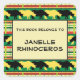Black and yellow rhinos march across green stripes alternating with loosely “woven” stripes in African colours of red, black and green with yellow accents.