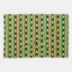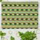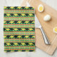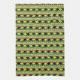 Black and yellow rhinos march across green stripes alternating with loosely “woven” stripes in African colours of red, black and green with yellow accents.