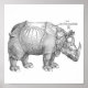 Albrecht Dürer's Rhinoceros is a woodcut that he based on a written description & brief sketch by an unknown artist of an Indian rhinoceros that had arrived in Lisbon earlier that year. Dürer never saw the actual rhinoceros, which was the first living example seen in Europe since Roman times. In late 1515, the King of Portugal, Manuel I, sent the animal as a gift for Pope Leo X, but it died in a shipwreck off the coast of Italy in early 1516. A live rhinoceros was not seen again in Europe until a second specimen arrived from India at the court of Philip II in Spain around 1579.[2][3] Dürer's woodcut is not an accurate representation of a rhinoceros. He depicts an animal with hard plates that cover its body like sheets of armour, with a gorget at the throat, a solid-looking breastplate, and rivets along the seams; and a small twisted horn on its back, scaly legs & saw-like rear quarters.