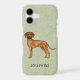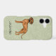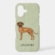 Destei's original cartoon illustration of an adorable Rhodesian Ridgeback breed dog. The dog is pictured from the side while standing and looking towards the viewer. The dog is reddish brown in colour and there are dark details on the dog's face including the nose and eyes. The dog's tail curves slightly and is darker towards the tip. This design is ideal for anyone who adores the African Lion Dog breed. The background colour is green with a light texture. The background colour can be changed to any other colour and the texture can be removed, if so wished. There is also a personalizable text area for a name or other custom text.