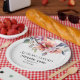 This elegant wedding paper plate showcases a beautiful rhododendron branch adorned with peach-pink flowers and greenery at the upper part. The couple's names are prominently displayed in decorative typography, adding a personal touch to the design. A heartfelt message of 'Thank You' is also included, expressing gratitude to the guests. Completing the look, a stylish thin black border gracefully adorns the plate, adding a touch of sophistication to any wedding celebration.