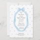 Celebrate the arrival of baby girl with this light blue and white baby shower invitation. A light blue bow and ribbon surrounds the invitation details, while the background consist of blue polka dots. The back of the card features the same polka dot pattern.