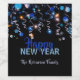 Personalised New Year wine label design featuring shiny ribbons and bokeh lights on a black background. The text is fully customisable.