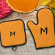 A minimalist and stylish pot holder and oven mitt set, in a festive pumpkin yellow colour. Personalise with your initial as a monogram.