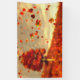 Against the backdrop of a lone maple in a hillside, bright orange and yellow autumn leaves float on the breeze.