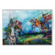 Mediaeval knights with horses ,colourful and expressive contemporary figurative painting in vibrant blue,red,green white,brown colours,watercolor by Alessandro Lumini 1989 Inspired from the legend of King Arthur and the Knights of the Round Table .